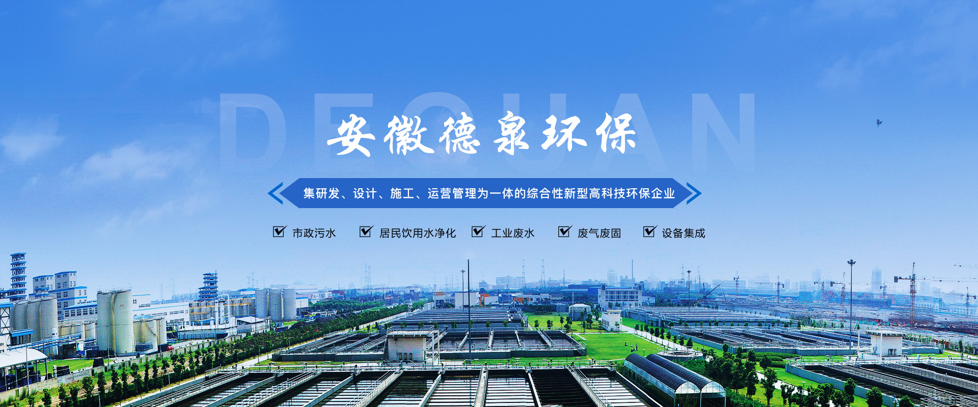 安徽德泉環(huán)保科技有限公司致力于廢水、廢氣、固廢技術(shù)處理研發(fā)、設(shè)計(jì)、施工及運(yùn)營(yíng)管理,從事環(huán)保設(shè)備及設(shè)施的制造和銷(xiāo)售,為環(huán)保項(xiàng)目系統(tǒng)提供專(zhuān)業(yè)的技術(shù)咨詢(xún)和服務(wù)。是一家集建筑勞務(wù)分包,工程總承包(EPC)、項(xiàng)目投資(BOT/PPP)、運(yùn)營(yíng)管理(O&M)于一體的綜合性新型高科技企業(yè)。